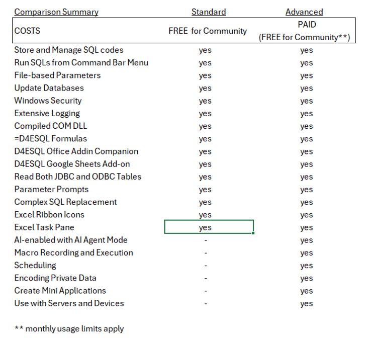 The main use case of the Community Plan Standard Features is for an unlimited number of SQL Developers to write unlimited number of SQLs in simple agreed formats and store them in Excel spreadsheets, so that select Business Users can easily run them via menus and without SQL knowledge. These select few Business Users may also upgrade to the Advanced Version to gain additional features that are primarily business-oriented and cost-justified.